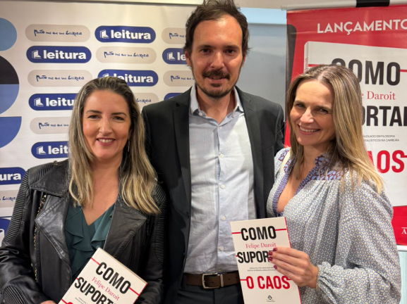 Na última terça-feira (7), a Livraria Leitura, no Barra Shopping Sul, em Porto Alegre, sediou o lançamento oficial do livro Como Suportar o Caos, do jornalista e Coordenador de Comunicação da DPE/RS, Felipe Daroit. A ADPERGS esteve representada no evento pela Vice-Presidenta Administrativa-Financeira, Jamile Rodrigues Nehmé de Toledo, e pela Diretora Social e Cultural, Sabrina Backes.